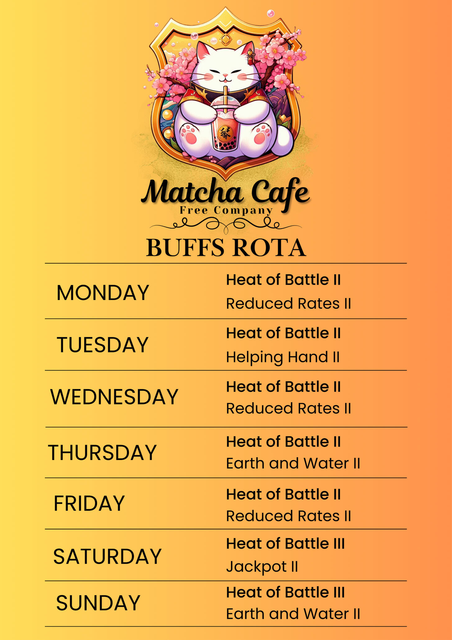 Please be mindful the rota for FC buffs are subject to change depending on demand and any content that gets added that could require a change.The buffs are reset every afternoon so please keep in mind that Mondays buffs will be put up Sunday afternoon/night and so on.